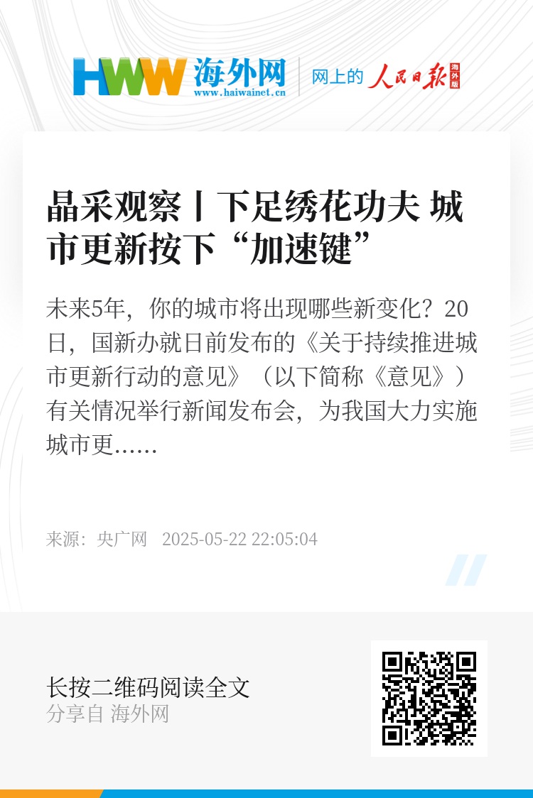 未来5年,你的城市将出现哪些新变化?20日,国新办就日前发布的《关于持续推进城市更新行动的意见》(以下简称《意见》)有关情况举行新闻发布会,为我国大力实施城市更新按下“加速键”。这份《意见》是自“十四五”规划明确提出实施城市更新行动以来,国家对城市更新下一步要干什么、怎么干提出了具体的要求。