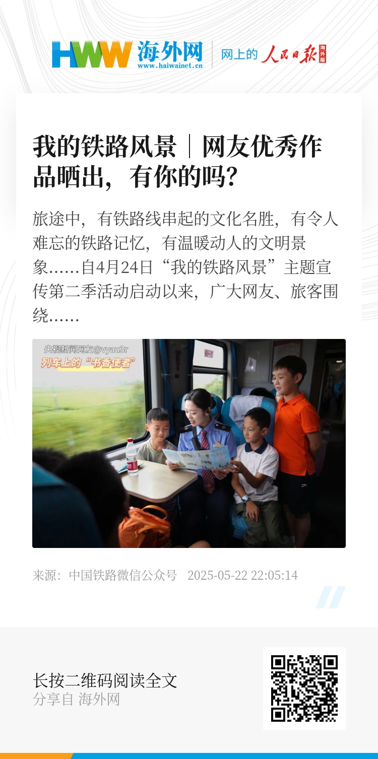 旅途中,有铁路线串起的文化名胜,有令人难忘的铁路记忆,有温暖动人的文明景象......自4月24日“我的铁路风景”主题宣传第二季活动启动以来,广大网友、旅客围绕“美好旅途、文化相伴”主题,用镜头记录所见所闻、用笔墨讲述亲身感受,目前已征集到原创作品8万余个。我们再次从中精选部分优秀作品进行展示,共同分享旅途中的文化风景。