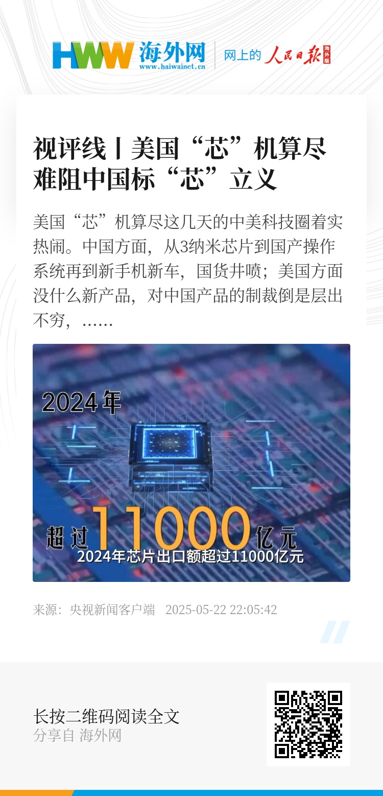 2018年美国开打对华贸易战,2019年起中国获得国际授权的专利数量就超越了美国。2018年,中国芯片出口额5591亿元,2024年芯片出口额超过11000亿元,实现了翻倍。美国的对华围堵,越来越左支右绌。只说今年,美国提议限制中国传统芯片出口,但因为“含有中国成熟制程芯片的产品占美国市场比例高达四分之三”且没找到替代品,又不得不暂时对电子产品关税豁免;一边不让中国进口先进芯片,说中国AI离不开美国“芯”,一边又限制中国出口先进芯片,因为觉得中国AI芯片有威胁…