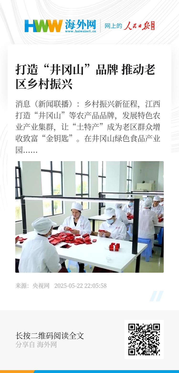 央视网消息(新闻联播):乡村振兴新征程,江西打造“井冈山”等农产品品牌,发展特色农业产业集群,让“土特产”成为老区群众增收致富“金钥匙”。