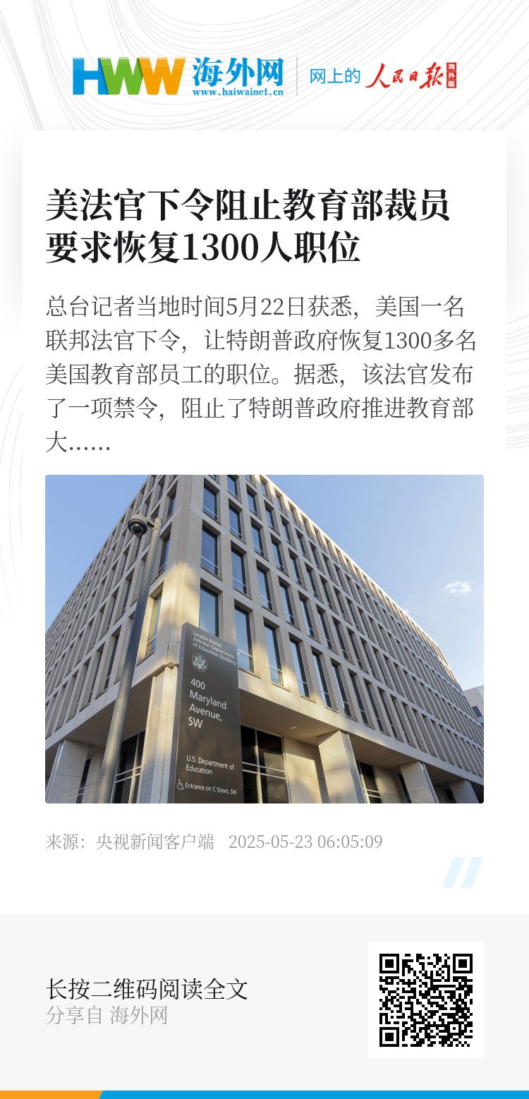 总台记者当地时间5月22日获悉,美国一名联邦法官下令,让特朗普政府恢复1300多名美国教育部员工的职位。据悉,该法官发布了一项禁令,阻止了特朗普政府推进教育部大规模裁员的计划。