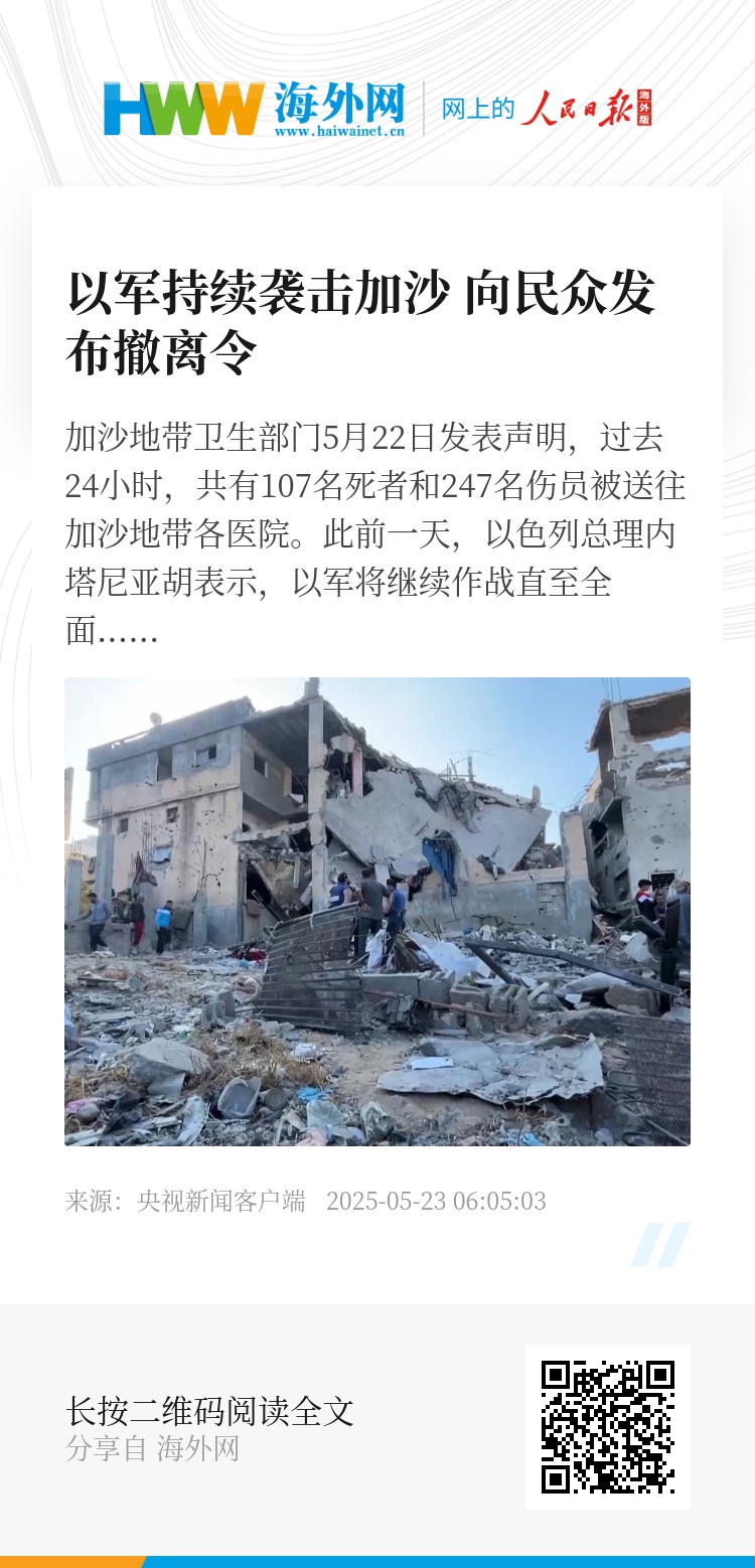 加沙地带卫生部门5月22日发表声明,过去24小时,共有107名死者和247名伤员被送往加沙地带各医院。