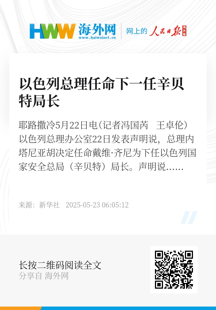 新华社耶路撒冷5月22日电(记者冯国芮 王卓伦)以色列总理办公室22日发表声明说,总理内塔尼亚胡决定任命戴维·齐尼为下任以色列国家安全总局(辛贝特)局长。