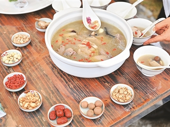 中国药膳研究会会长蒋健介绍,中医药膳是在中医药理论指导下,将不同中药材与食材合理搭配制成的特色膳食,对身体有调理作用。中医药膳源于“食药两用”“蕴医于食,寓养于膳”,既将药物作为食物,又将食物赋以药用,药借食力,食助药威,二者相辅相成,相得益彰,既可御病强身,又可协同医疗,成为大众养生保健、主动健康的有效方法。