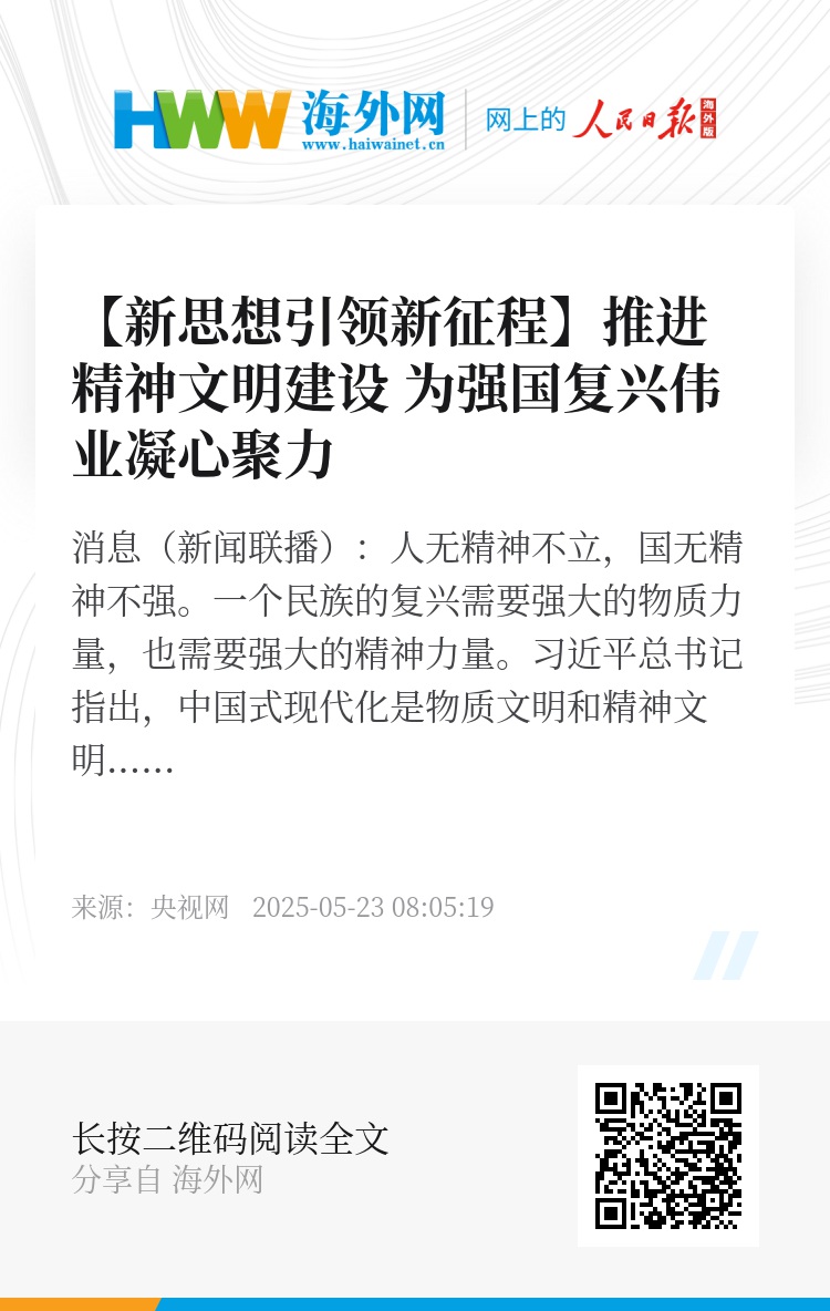 央视网消息(新闻联播):人无精神不立,国无精神不强。一个民族的复兴需要强大的物质力量,也需要强大的精神力量。习近平总书记指出,中国式现代化是物质文明和精神文明相协调的现代化,物质富足、精神富有是社会主义现代化的根本要求。党的十八大以来,以习近平同志为核心的党中央高度重视社会主义精神文明建设,大力发展社会主义先进文化,加强理想信念教育,传承中华文明,为强国建设、民族复兴伟业注入强大精神动力。