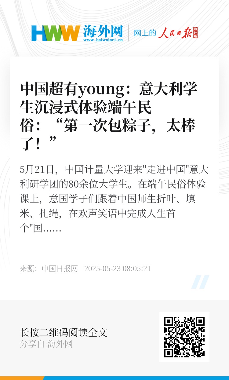 5月21日,中国计量大学迎来"走进中国"意大利研学团的80余位大学生。在端午民俗体验课上,意国学子们跟着中国师生折叶、填米、扎绳,在欢声笑语中完成人生首个"国际版"粽子。来自意大利的晨曦同学表示:"包粽子是一个非常好的机会,一方面可以交很多新的朋友, 另一方面可以深入了解中国文化,我觉得太棒了!"(拍摄:陈虹 视频:于涵 编辑:刘世东 潘一侨)