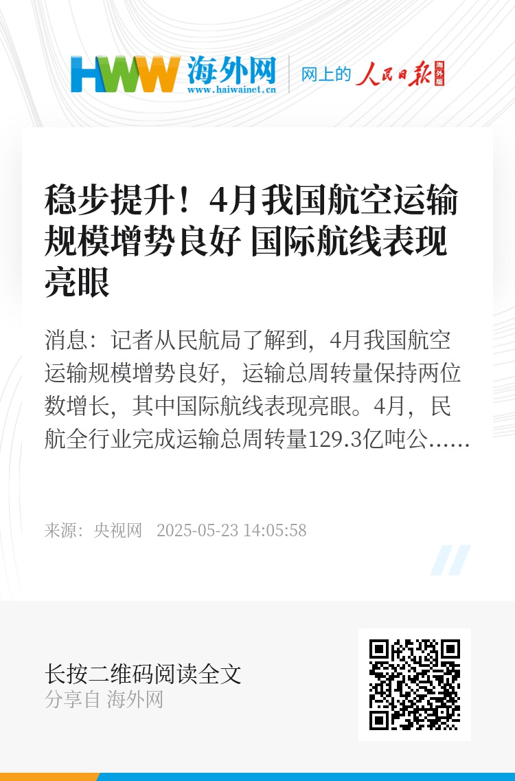 央视网消息:记者从民航局了解到,4月我国航空运输规模增势良好,运输总周转量保持两位数增长,其中国际航线表现亮眼。