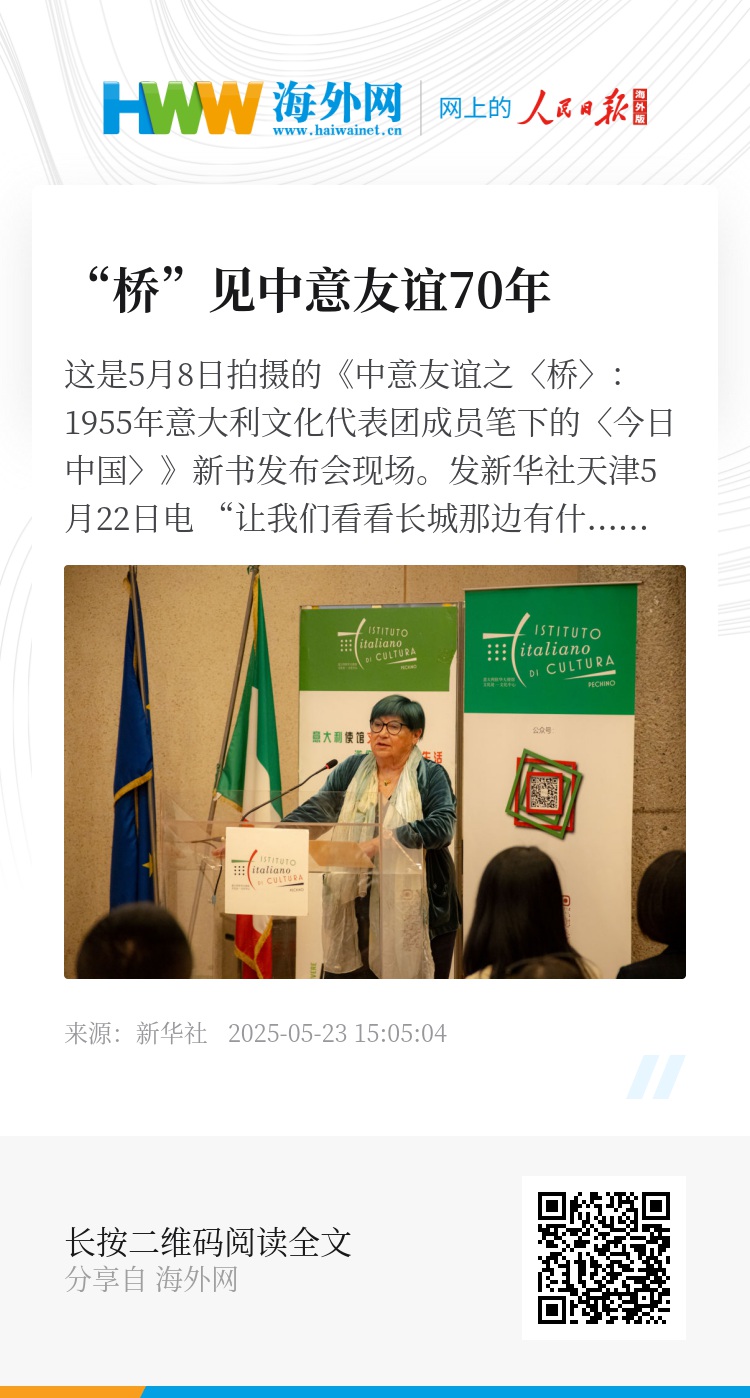 70年后的2025年5月,由杨琳与乐小悦主编的《中意友谊之〈桥〉:1955年意大利文化代表团成员笔下的〈今日中国〉》在意大利驻华使馆文化中心正式发布,精选了当年特刊中的文章译成中文,并配以1955年代表团访华的珍贵图片重新编著,完成了这座“桥”穿越70年的时空对话。