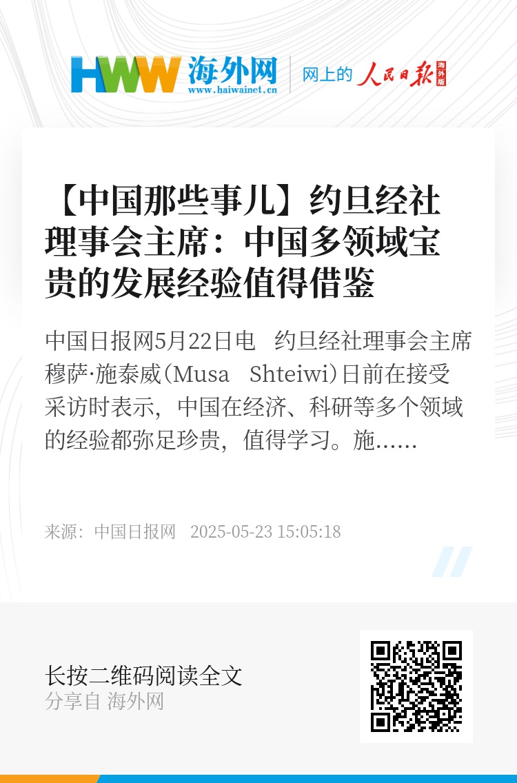 中国日报网5月22日电 约旦经社理事会主席穆萨·施泰威(Musa Shteiwi)日前在接受采访时表示,中国在经济、科研等多个领域的经验都弥足珍贵,值得学习。
