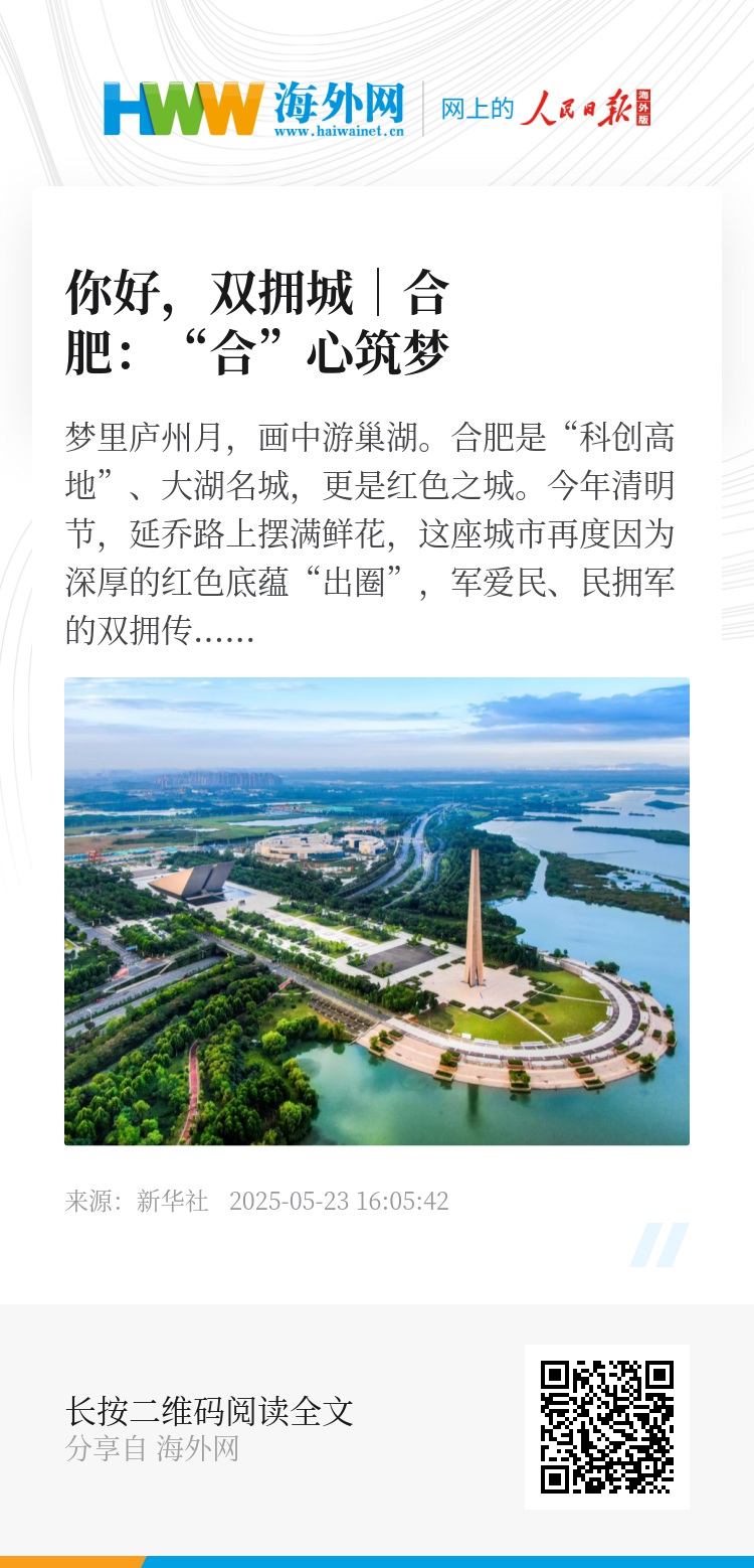 梦里庐州月,画中游巢湖。合肥是“科创高地”、大湖名城,更是红色之城。今年清明节,延乔路上摆满鲜花,这座城市再度因为深厚的红色底蕴“出圈”,军爱民、民拥军的双拥传统在这片土地上赓续传承。今年4月,合肥连续第10次获评“全国双拥模范城”。