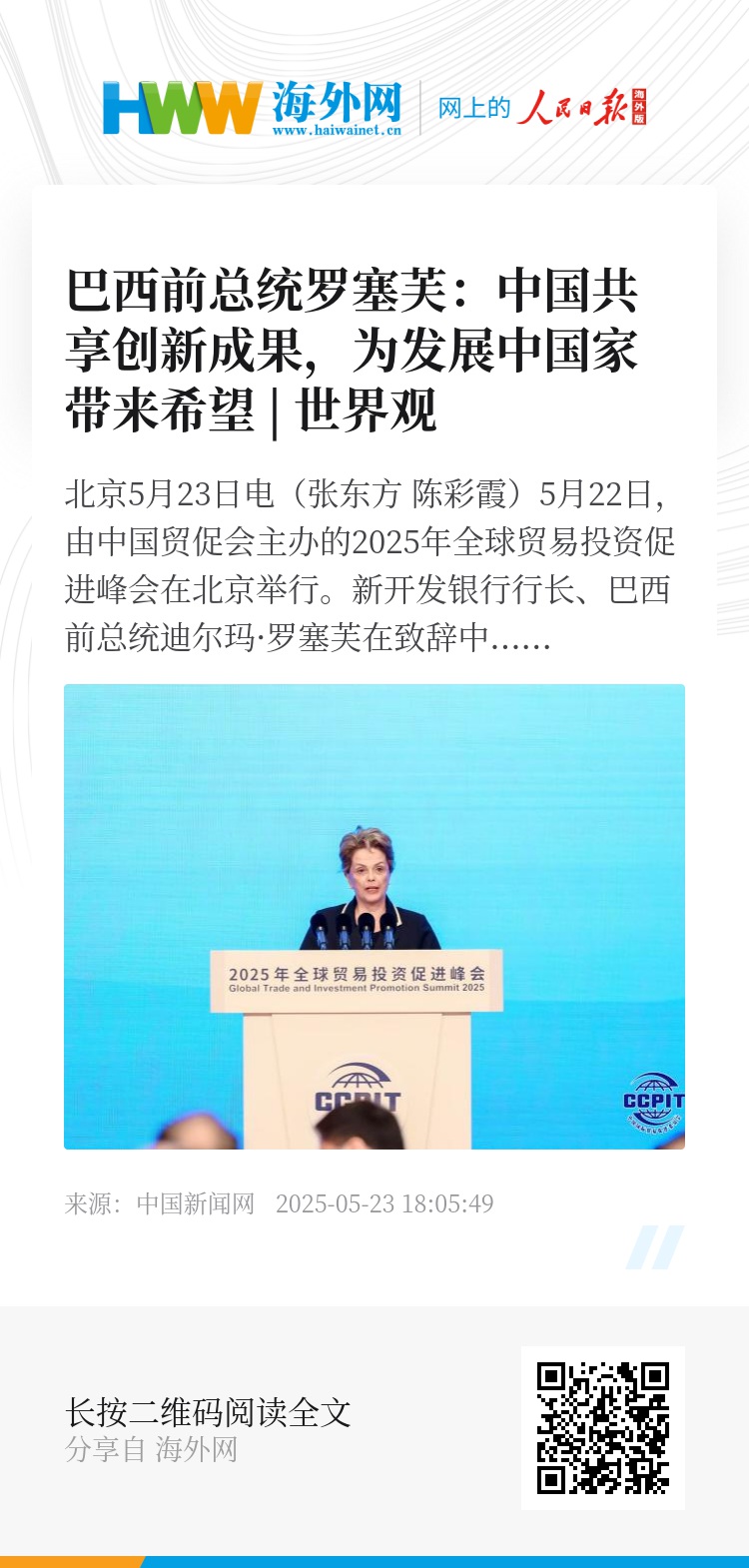 新开发银行行长、巴西前总统迪尔玛·罗塞芙在致辞中表示,美国大规模贸易保护主义政策对全球经济造成巨大压力,其“对等关税”政策进一步加剧了全球经济的脆弱性,限制各国发展及技术获取能力。中国秉持共赢理念,明确支持技术与创新成果共享,为新兴市场和发展中国家带来希望。