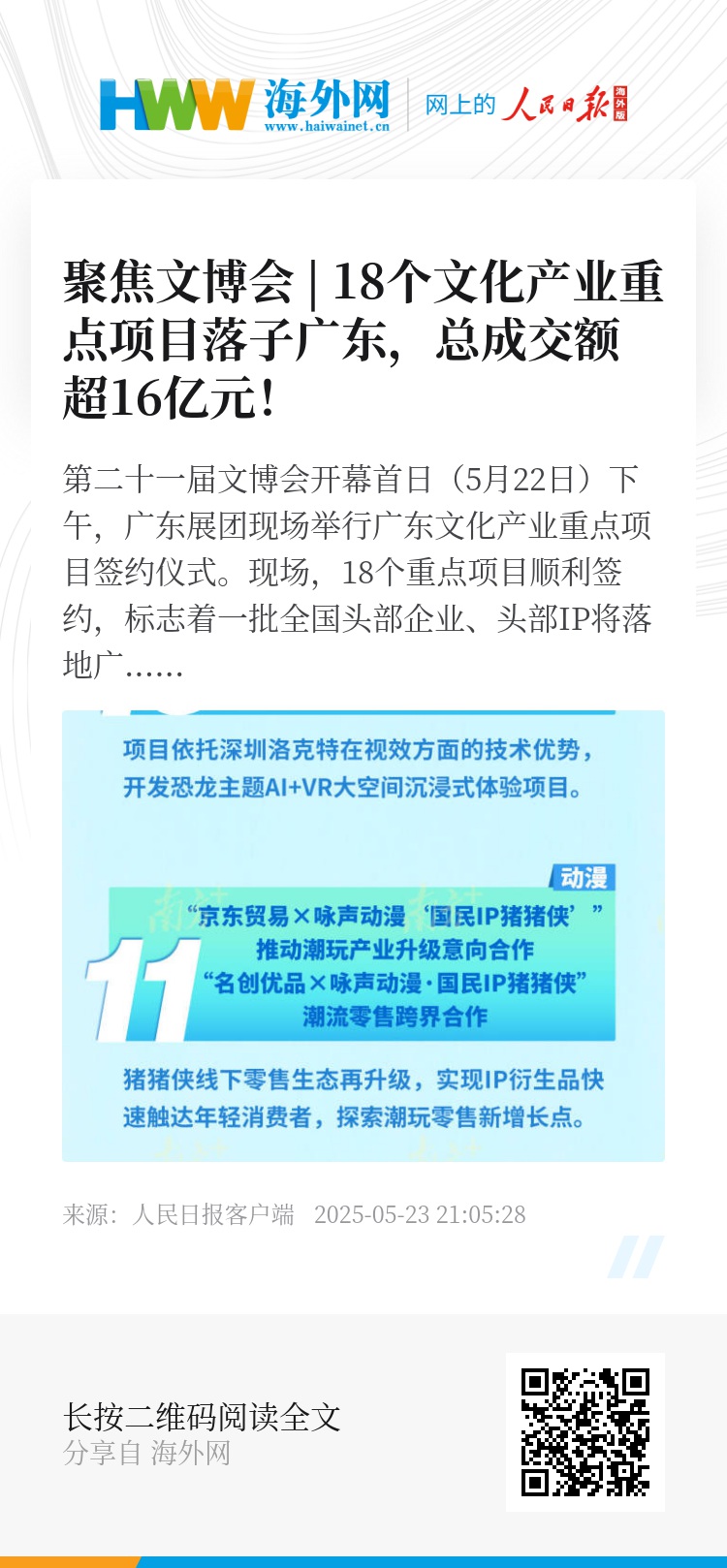 第二十一届文博会开幕首日(5月22日)下午,广东展团现场举行广东文化产业重点项目签约仪式。现场,18个重点项目顺利签约,标志着一批全国头部企业、头部IP将落地广东或与广东合作,总成交额超16亿元。