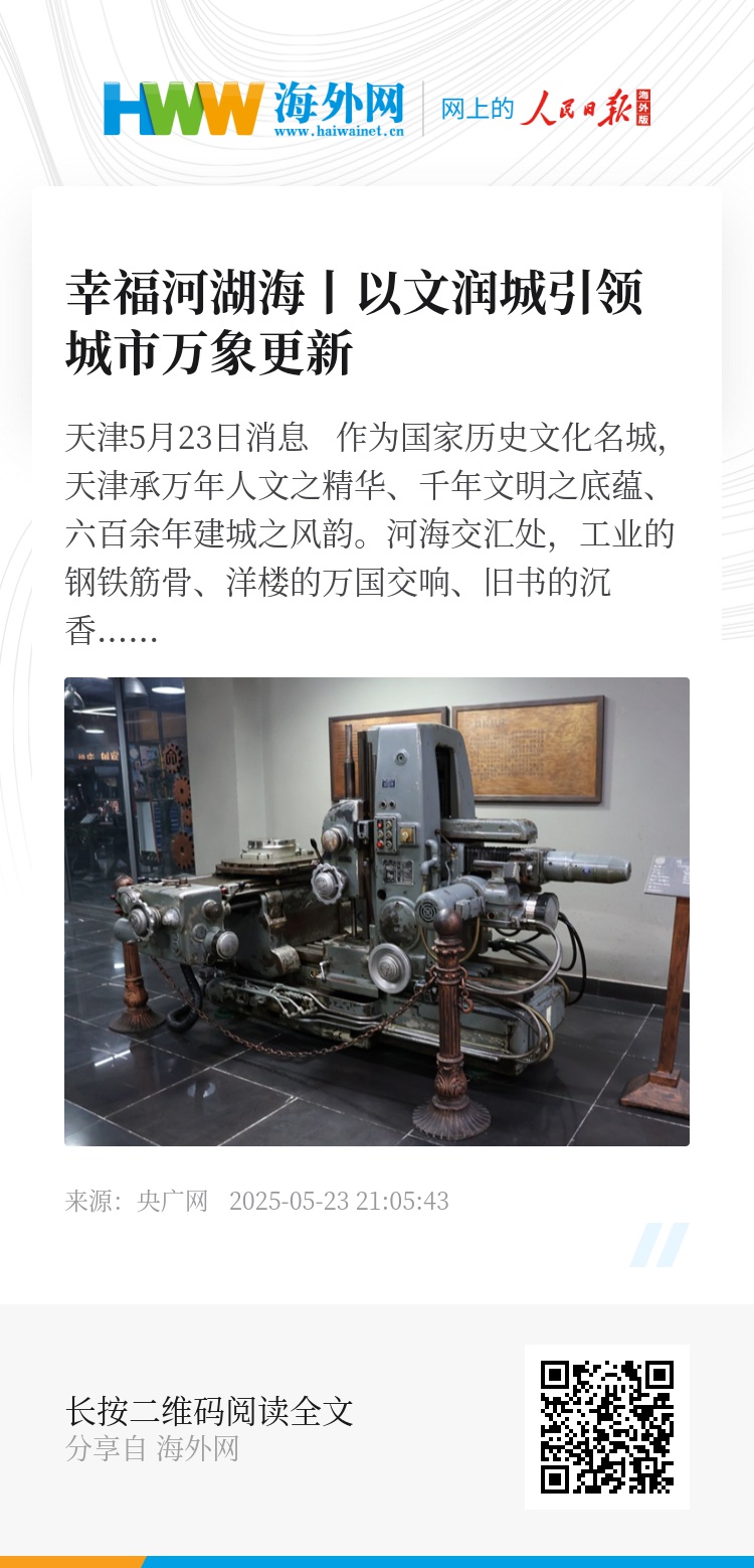央广网天津5月23日消息 作为国家历史文化名城,天津承万年人文之精华、千年文明之底蕴、六百余年建城之风韵。河海交汇处,工业的钢铁筋骨、洋楼的万国交响、旧书的沉香绵长,正驱动着时光的齿轮,扭转交织成独特的文化脉络。