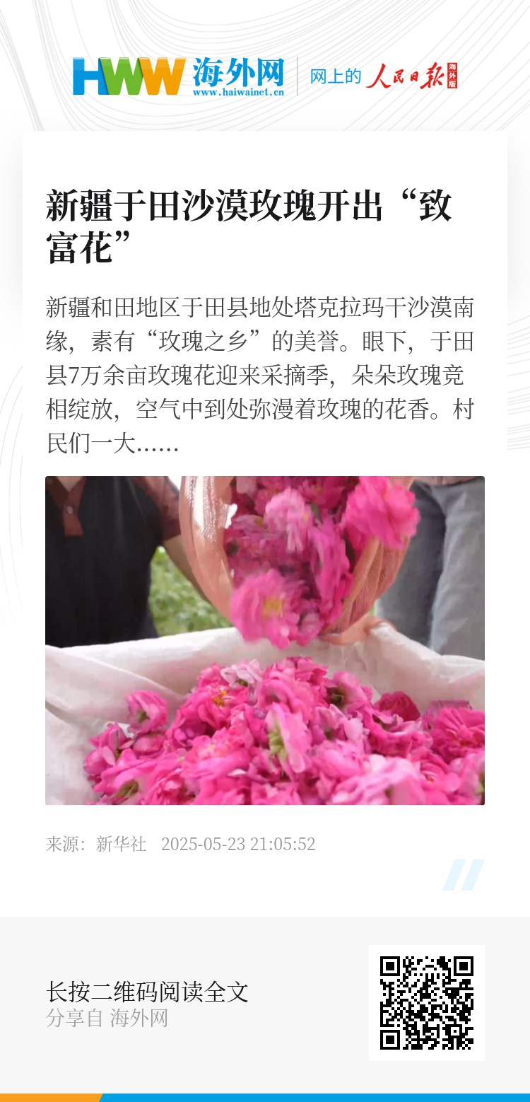 于田县有着悠久的沙漠玫瑰种植历史。在防沙治沙的过程中,当地群众通过不断培育和嫁接,目前已经在沙漠区域培育出耐旱、适应性强的玫瑰品种。2024年11月28日,塔克拉玛干沙漠“锁边工程”最后合龙的地方,当地村民种下了10万株玫瑰。经过半年时间的生长,10万株玫瑰的存活率达到了90%,兼具生态效益和经济效益的玫瑰花正在沙漠尽情绽放。