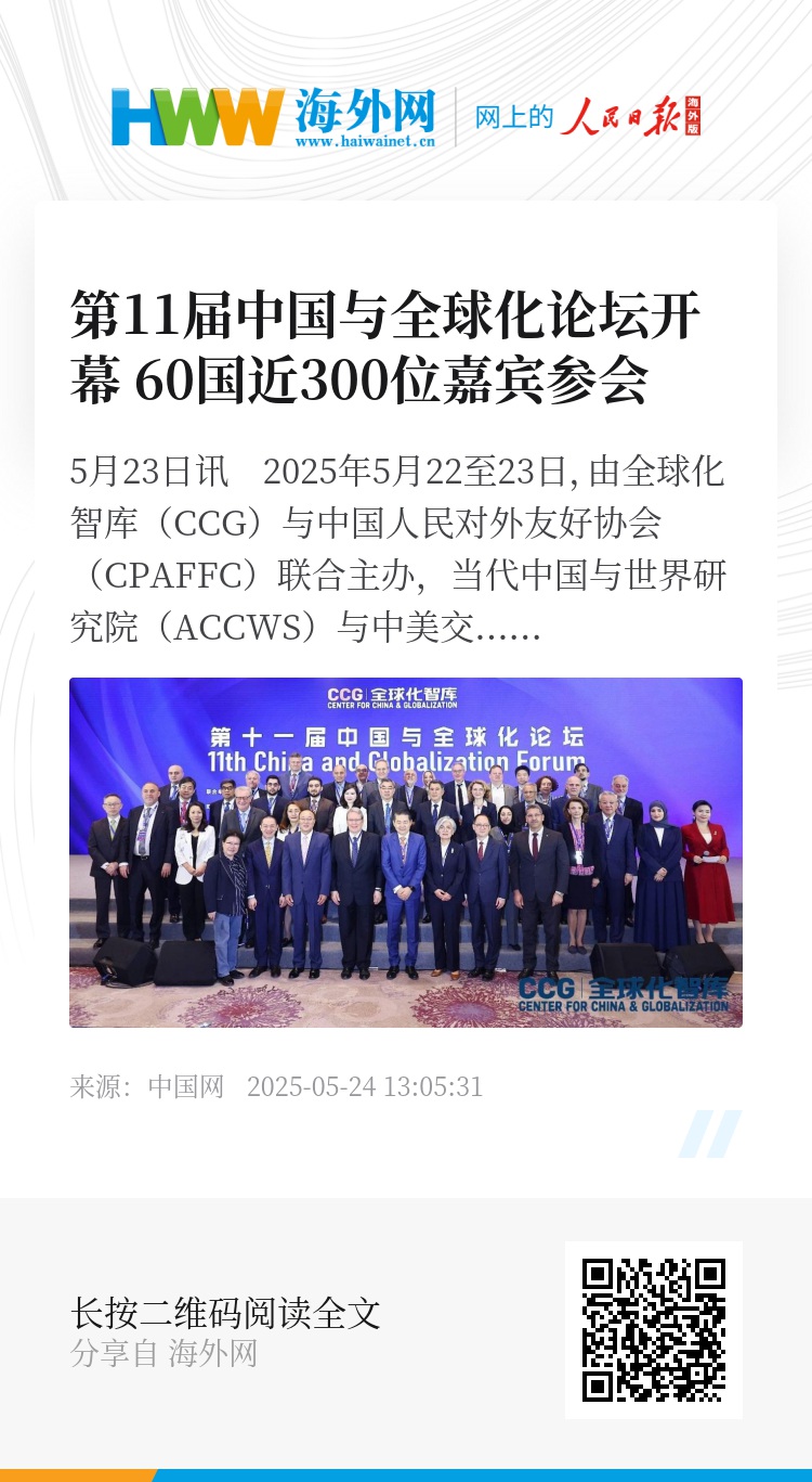 中国网5月23日讯 2025年5月22至23日,由全球化智库(CCG)与中国人民对外友好协会(CPAFFC)联合主办,当代中国与世界研究院(ACCWS)与中美交流基金会(CUSEF)协办的“第十一届中国与全球化论坛”在北京开幕。本届论坛吸引了来自五大洲近60个国家的300余位政商学界代表参与。