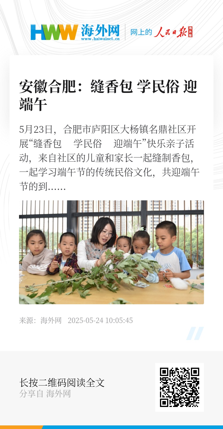 5月23日,合肥市庐阳区大杨镇名鼎社区开展“缝香包 学民俗 迎端午”快乐亲子活动,来自社区的儿童和家长一起缝制香包,一起学习端午节的传统民俗文化,共迎端午节的到来。图源:IC photo