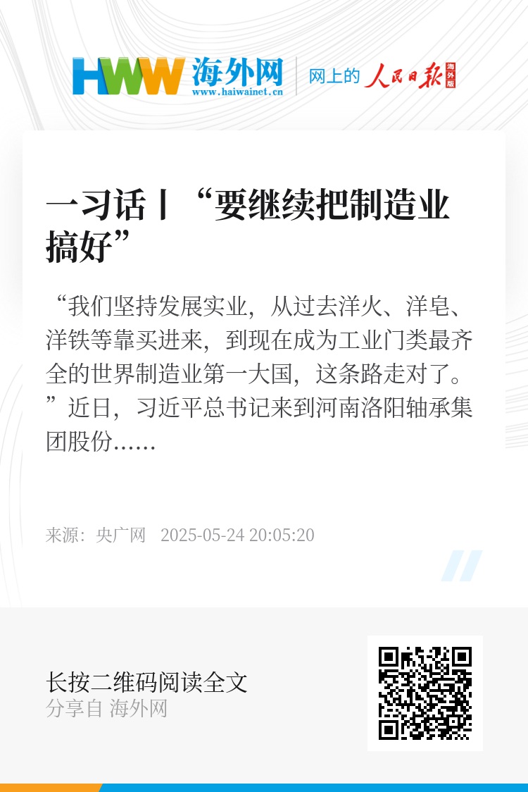 “我们坚持发展实业,从过去洋火、洋皂、洋铁等靠买进来,到现在成为工业门类最齐全的世界制造业第一大国,这条路走对了。”近日,习近平总书记来到河南洛阳轴承集团股份有限公司考察,走进企业智能工厂,察看智能生产线,同企业职工亲切交谈。回望历史,总书记十分感慨,深刻指出发展制造业对中国式现代化建设的重要意义,勉励大家“要继续把制造业搞好”。