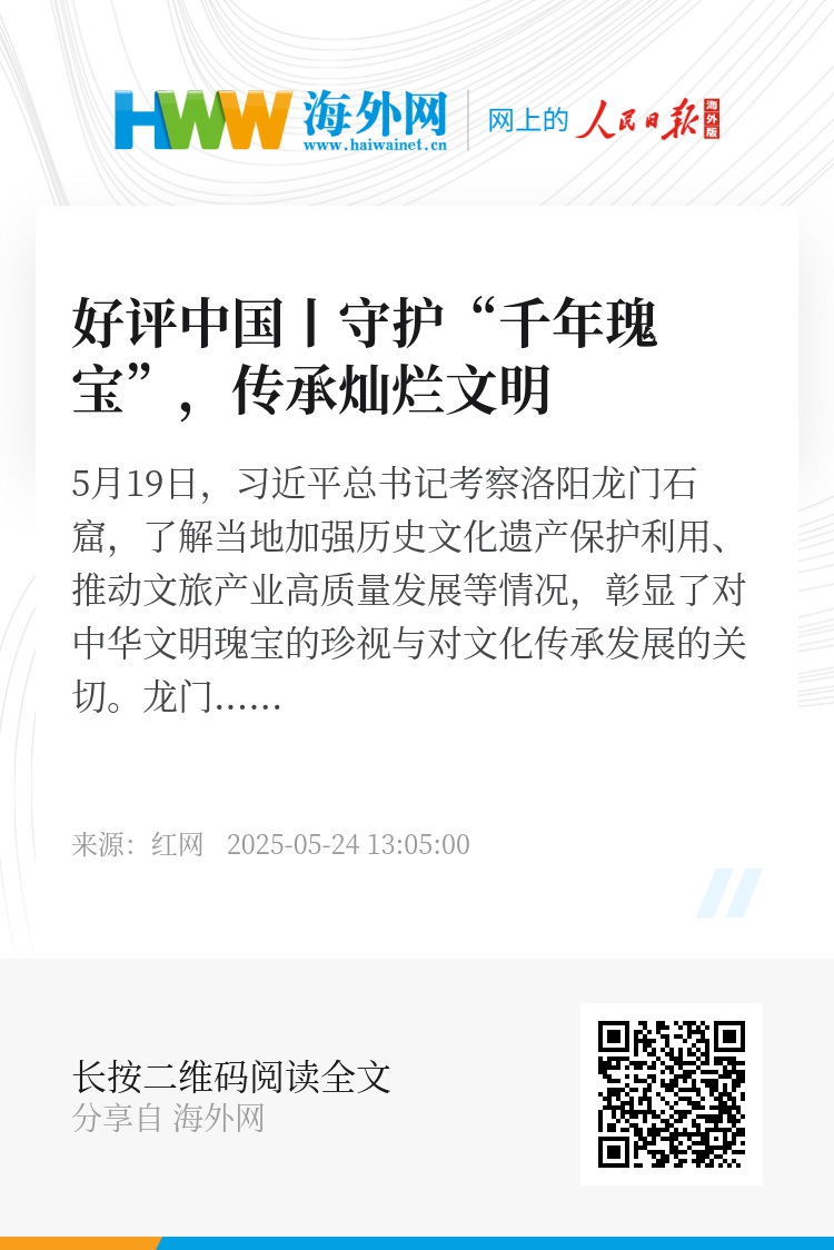 5月19日,习近平总书记考察洛阳龙门石窟,了解当地加强历史文化遗产保护利用、推动文旅产业高质量发展等情况,彰显了对中华文明瑰宝的珍视与对文化传承发展的关切。龙门石窟,这座镌刻在崖壁上的艺术丰碑,穿越千年风雨,承载着厚重历史,生动诠释着中华文明的包容与自信。