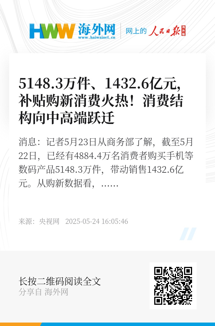 央视网消息:记者5月23日从商务部了解,截至5月22日,已经有4884.4万名消费者购买手机等数码产品5148.3万件,带动销售1432.6亿元。