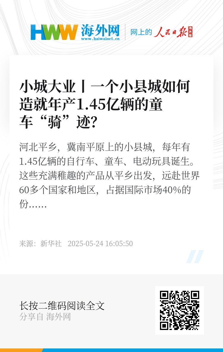 河北平乡,冀南平原上的小县城,每年有1.45亿辆的自行车、童车、电动玩具诞生。这些充满稚趣的产品从平乡出发,远赴世界60多个国家和地区,占据国际市场40%的份额。小童车如何扛起大产业?在平乡,天马行空的想象、永不枯竭的好奇心、从不言败的探索,化作对生活的无限热爱和驰骋世界的雄心。
