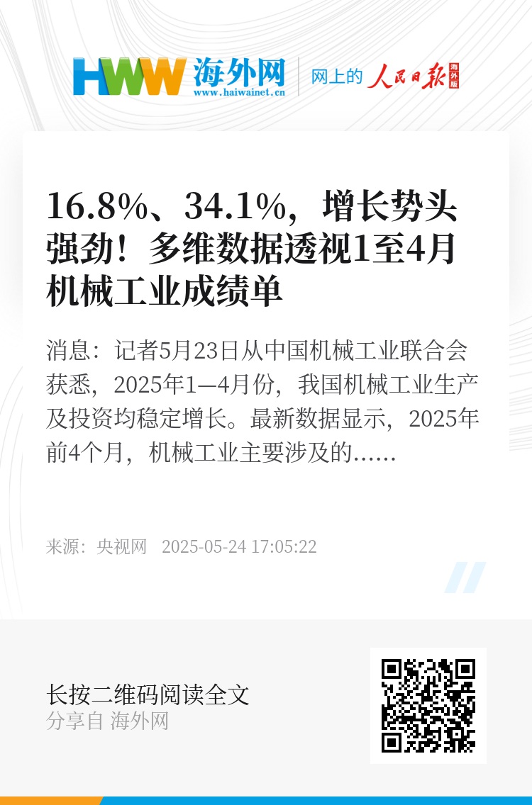 央视网消息:记者5月23日从中国机械工业联合会获悉,2025年1—4月份,我国机械工业生产及投资均稳定增长。