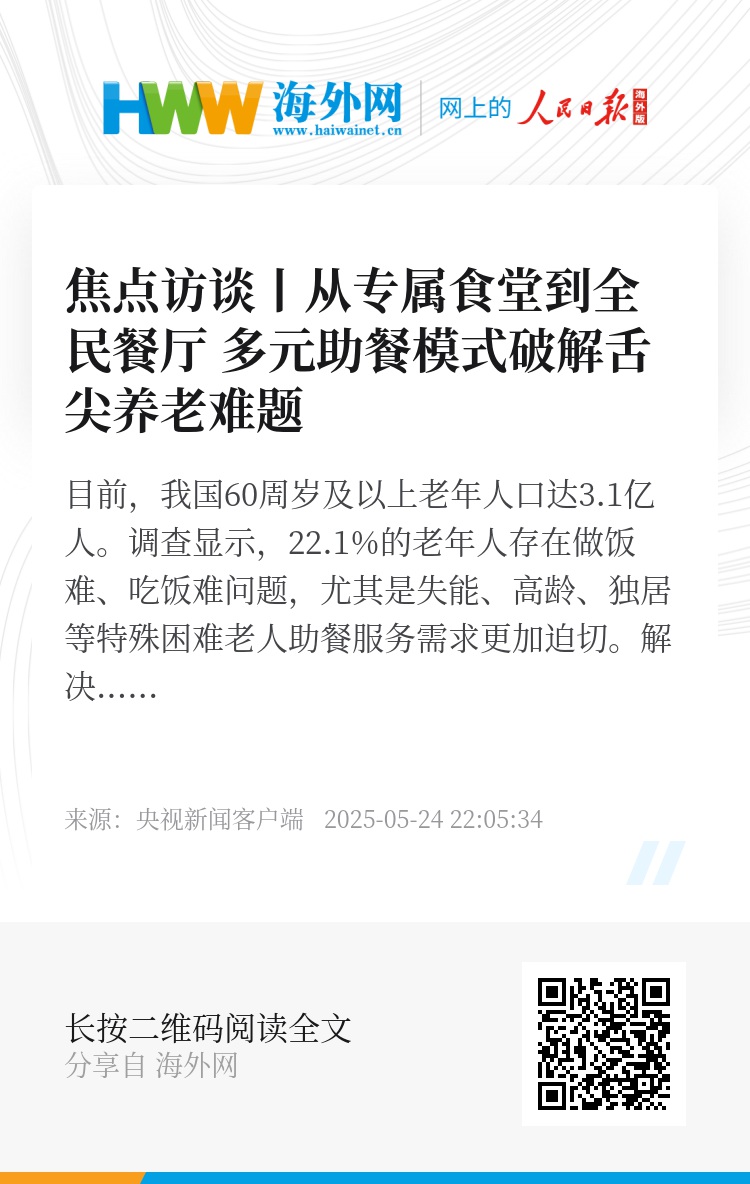 目前,我国60周岁及以上老年人口达3.1亿人。调查显示,22.1%的老年人存在做饭难、吃饭难问题,尤其是失能、高龄、独居等特殊困难老人助餐服务需求更加迫切。