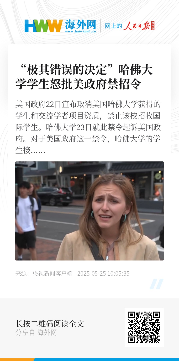 哈佛大学学生 蒂罗内·布雷斯怀特:我认为特朗普政府禁止哈佛大学招收国际学生是一个可怕的决定。美国是建立在多样性和“大熔炉”社会的基础之上,我们需要重视每个人,不能因为他们来自不同的地方就歧视他们。