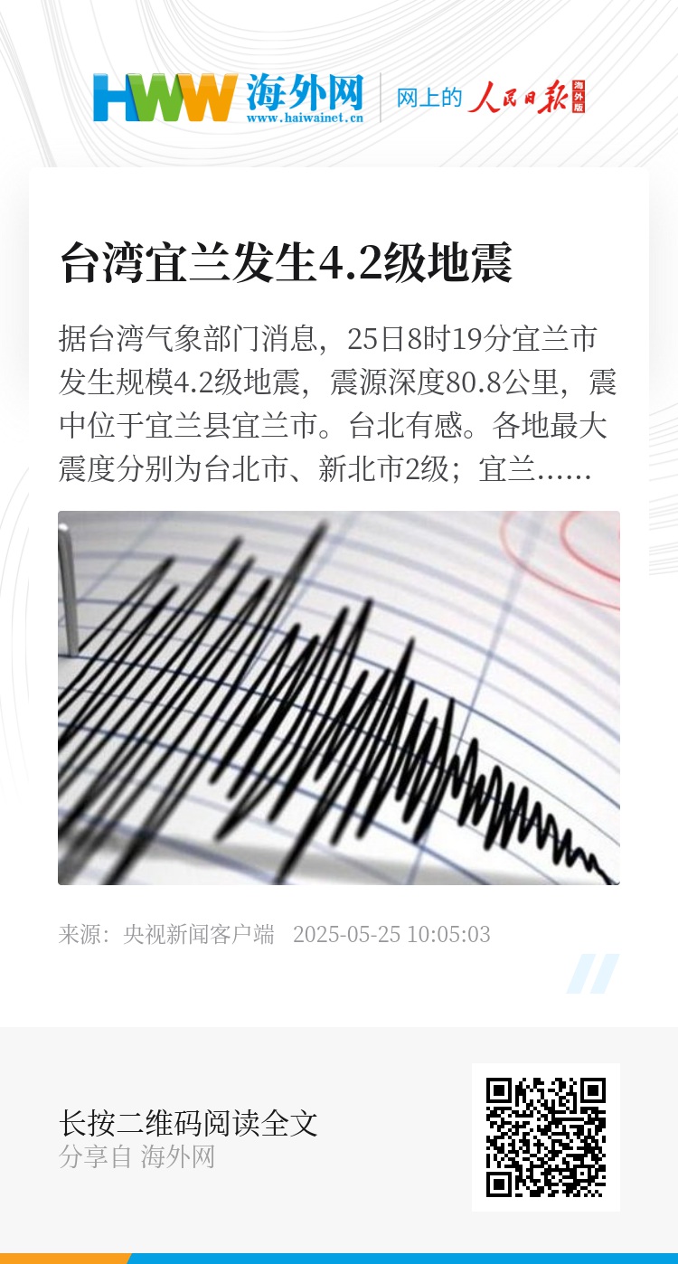 据台湾气象部门消息,25日8时19分宜兰市发生规模4.2级地震,震源深度80.8公里,震中位于宜兰县宜兰市。台北有感。