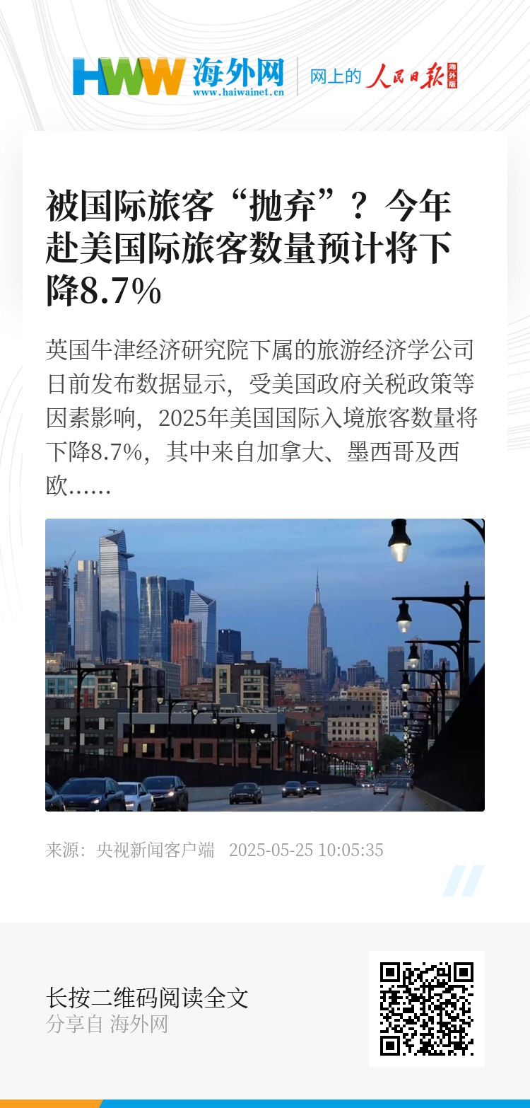 英国牛津经济研究院下属的旅游经济学公司日前发布数据显示,受美国政府关税政策等因素影响,2025年美国国际入境旅客数量将下降8.7%,其中来自加拿大、墨西哥及西欧国家的国际旅客数量降幅较大。