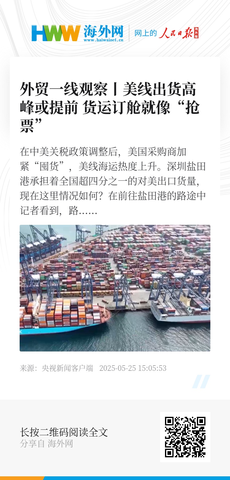 中国宏观经济研究院对外经济研究所研究员 原倩:不少美国商家利用这90天的窗口期加紧囤货,我国外贸厂商集中出货,短时间内明显提高货运需求,推动运价上涨。