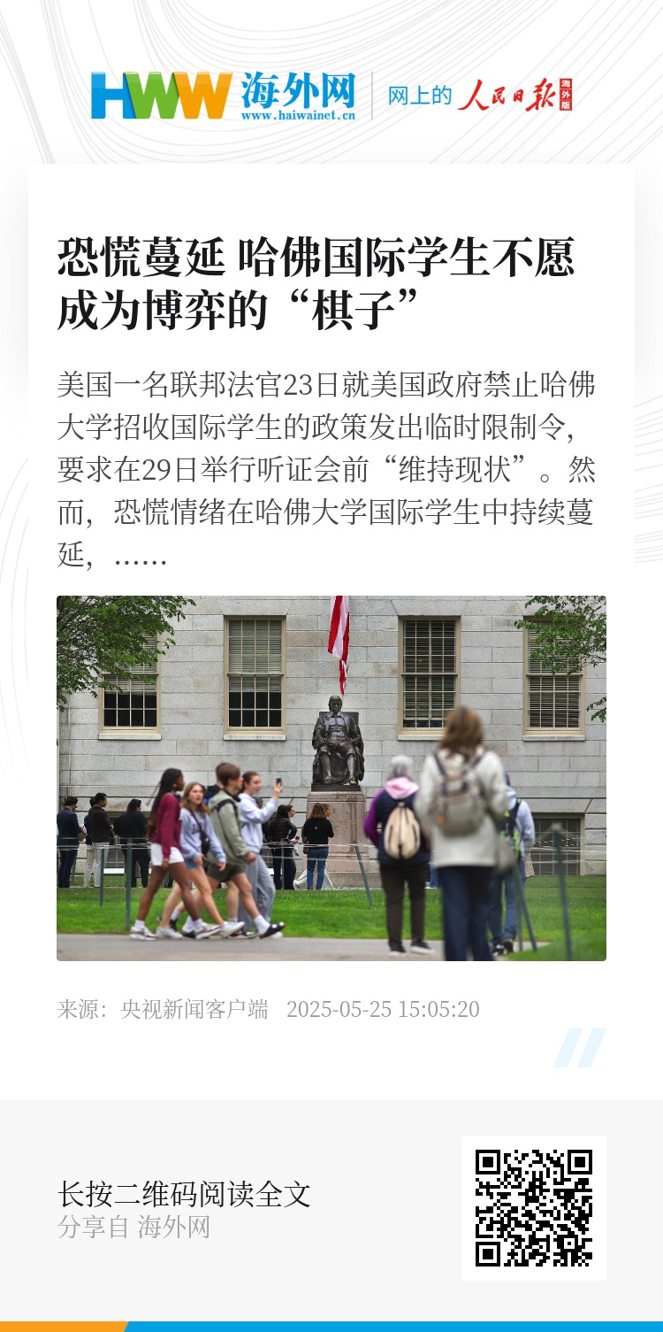 美国一名联邦法官23日就美国政府禁止哈佛大学招收国际学生的政策发出临时限制令,要求在29日举行听证会前“维持现状”。然而,恐慌情绪在哈佛大学国际学生中持续蔓延,一些学生表示他们不愿成为哈佛大学与美国政府博弈的“棋子”。