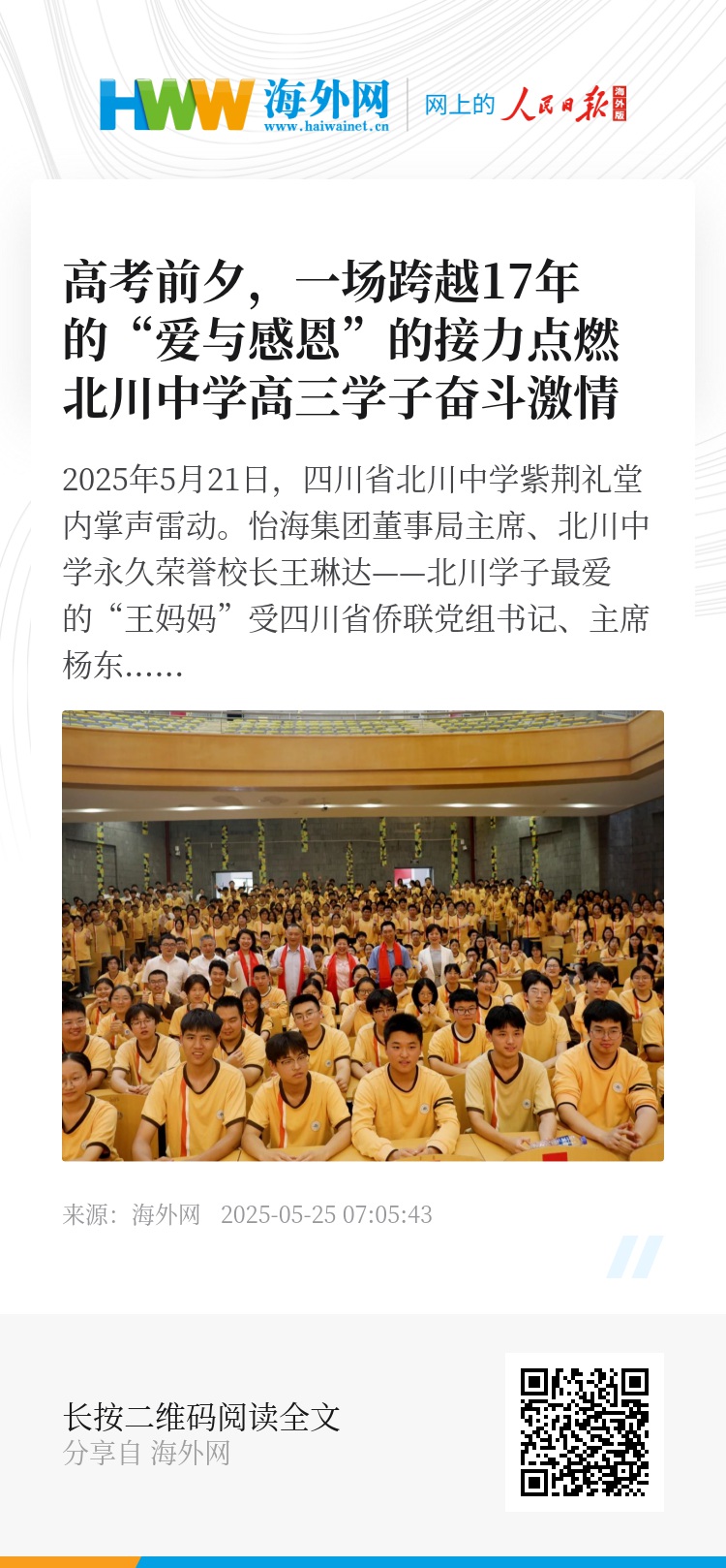 此次活动不仅延续了怡海王妈妈与北川17年如一日投身教育公益的初心,更以“传承”为纽带,承继责任接力的桥梁,展现了侨界力量在灾后重建与社会责任传承中的时代担当。北京怡海公益基金会副会长、怡海教育集团理事长王乐茵代表怡海教育集团向北川中学高三学子赠送礼物。她寄语高三的同学们,高考不是一座大山,要做终身的学习者!