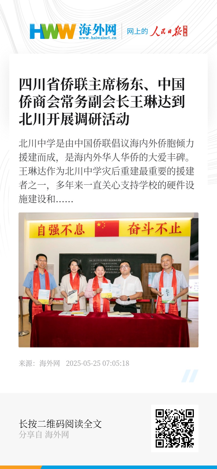 北川中学是由中国侨联倡议海内外侨胞倾力援建而成,是海内外华人华侨的大爱丰碑。王琳达作为北川中学灾后重建最重要的援建者之一,多年来一直关心支持学校的硬件设施建设和师资力量配置,为学校的持续发展做出了突出贡献。5月21日-22日,四川省侨联主席杨东、中国侨商会常务副会长王琳达一行,再次来到北川开展捐赠仪式并调研,助力北川学子逐梦远航。绵阳市政协副主席、致公党绵阳市工委主委田荣华,绵阳市侨联党组书记、主席范华,北川羌族自治县委常委、统战部长晁雪飞,北川中学党总支书记刘亚春陪同调研。