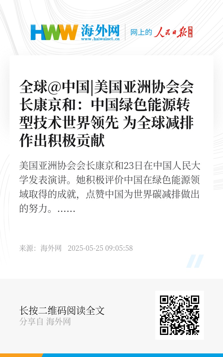 海外网5月25日电 美国亚洲协会会长康京和23日在中国人民大学发表演讲。她积极评价中国在绿色能源领域取得的成就,点赞中国为世界碳减排做出的努力。