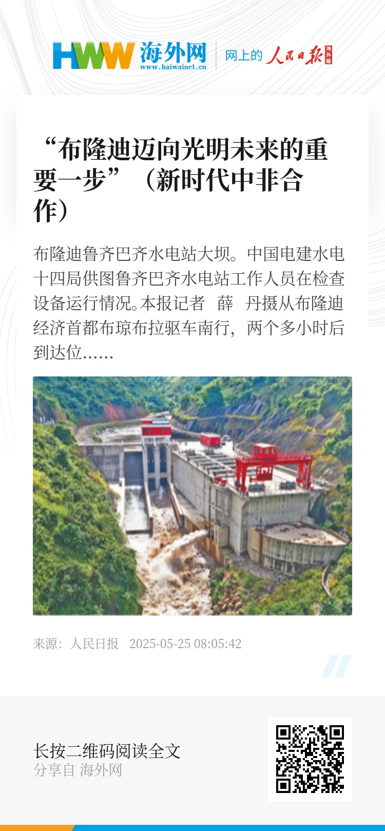 “鲁齐巴齐水电站对布隆迪的意义非凡。”布隆迪总统恩达伊施米耶表示,“中国在基础设施等领域与布隆迪开展平等合作,是布隆迪值得信赖的真诚朋友。中方始终给予我们坚定的支持。”
