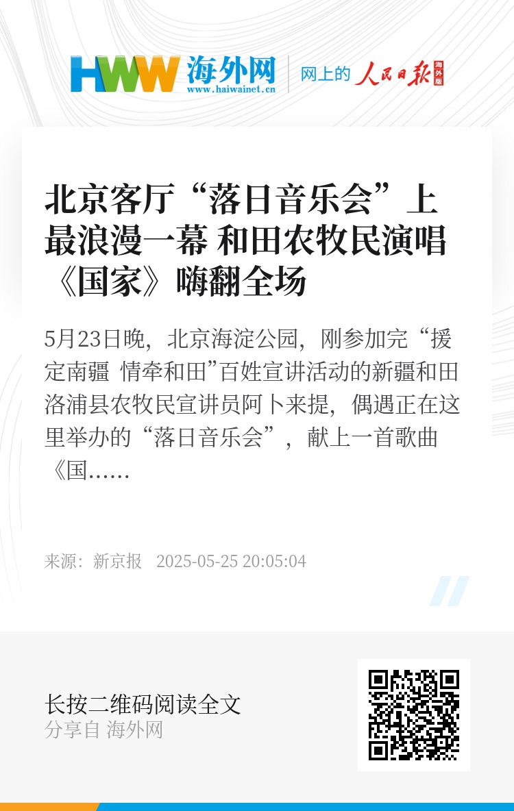 5月23日晚,北京海淀公园,刚参加完“援定南疆 情牵和田”百姓宣讲活动的新疆和田洛浦县农牧民宣讲员阿卜来提,偶遇正在这里举办的“落日音乐会”,献上一首歌曲《国家》。全场观众自发点亮手机,手机灯光与落日余晖交相辉映,演绎中国人独有的浪漫家国情怀。