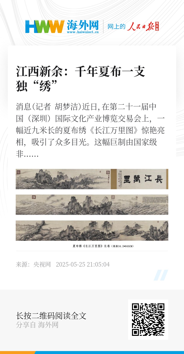 央视网消息(记者 胡梦洁)近日,在第二十一届中国(深圳)国际文化产业博览交易会上,一幅近九米长的夏布绣《长江万里图》惊艳亮相,吸引了众多目光。这幅巨制由国家级非遗夏布绣代表性传承人张小红及儿媳吴婉菁带领创作团队耗时13个月完成。十几种针法和三十多种颜色的丝线在作品中交错,用独特的刺绣语言展现了祖国的壮阔山河。