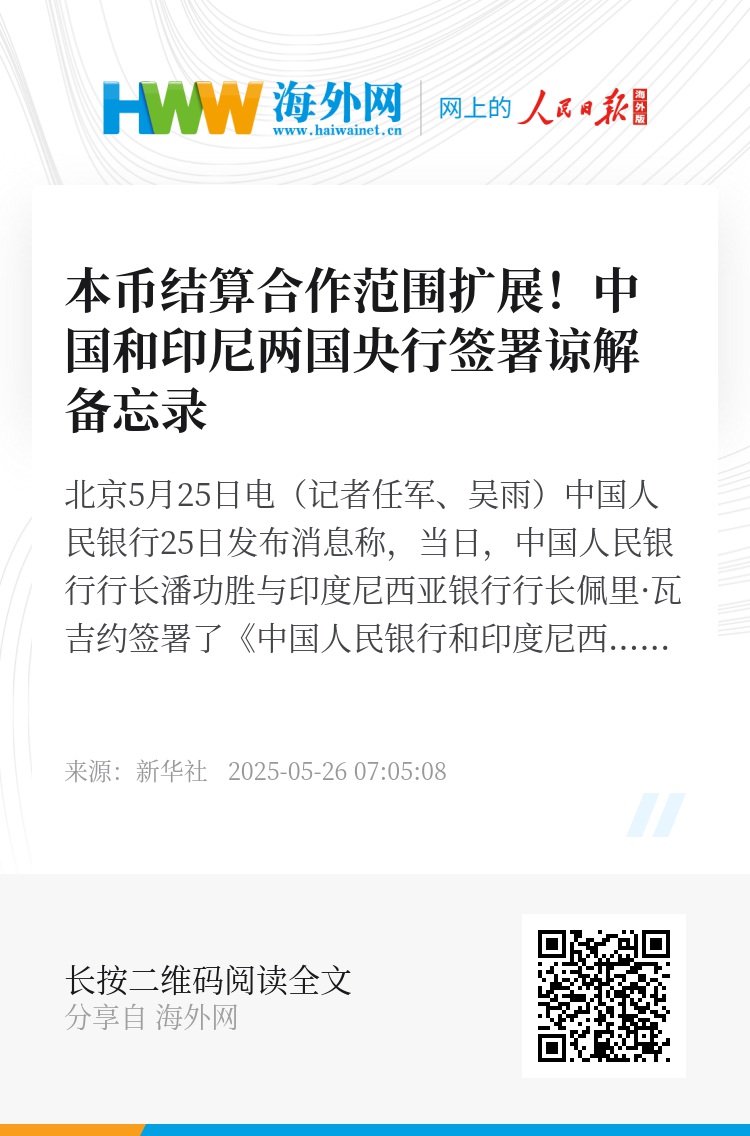 新华社北京5月25日电(记者任军、吴雨)中国人民银行25日发布消息称,当日,中国人民银行行长潘功胜与印度尼西亚银行行长佩里·瓦吉约签署了《中国人民银行和印度尼西亚银行关于建立促进双边交易本币结算合作框架的谅解备忘录》。