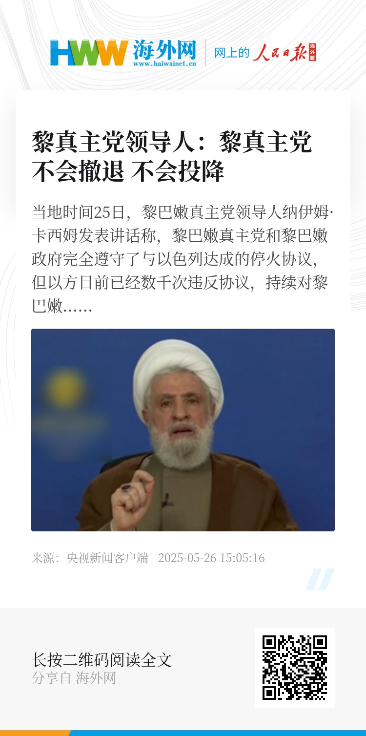 当地时间25日,黎巴嫩真主党领导人纳伊姆·卡西姆发表讲话称,黎巴嫩真主党和黎巴嫩政府完全遵守了与以色列达成的停火协议,但以方目前已经数千次违反协议,持续对黎巴嫩进行侵略。
