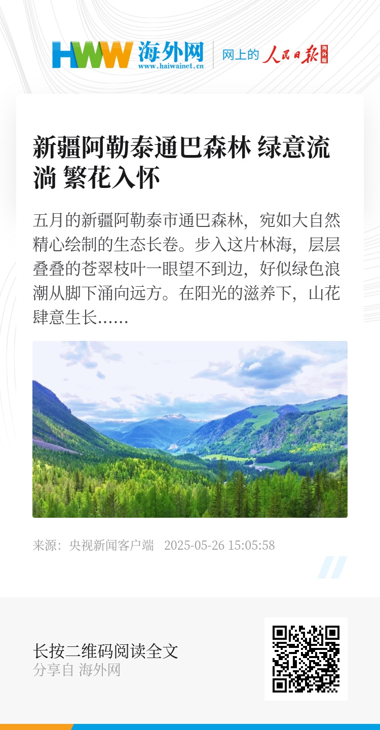五月的新疆阿勒泰市通巴森林,宛如大自然精心绘制的生态长卷。步入这片林海,层层叠叠的苍翠枝叶一眼望不到边,好似绿色浪潮从脚下涌向远方。在阳光的滋养下,山花肆意生长,为森林增添了灵动一笔,勾勒出独有的浪漫与生机。(总台记者 郭培宇 阿勒泰市融媒体中心)