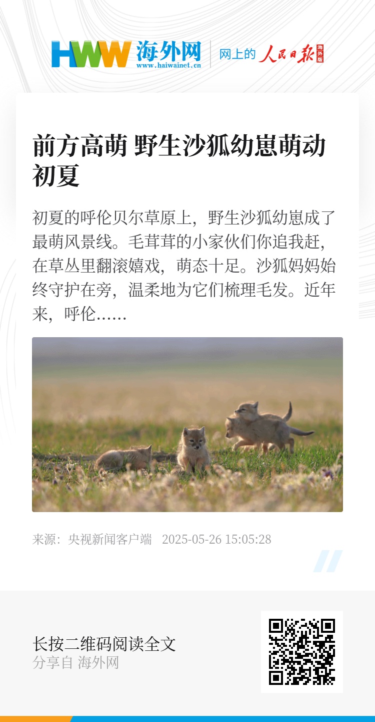 初夏的呼伦贝尔草原上,野生沙狐幼崽成了最萌风景线。毛茸茸的小家伙们你追我赶,在草丛里翻滚嬉戏,萌态十足。沙狐妈妈始终守护在旁,温柔地为它们梳理毛发。近年来,呼伦贝尔市新巴尔虎右旗通过实施禁牧休牧、草畜平衡等一系列科学有效的保护措施,草原综合植被覆盖度逐年提升,为沙狐等野生动物提供了理想栖息地。(总台记者 郑颖 张扬 陈晓东)