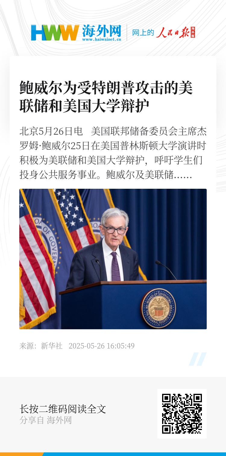 新华社北京5月26日电 美国联邦储备委员会主席杰罗姆·鲍威尔25日在美国普林斯顿大学演讲时积极为美联储和美国大学辩护,呼吁学生们投身公共服务事业。鲍威尔及美联储等近期成为美国总统唐纳德·特朗普政府攻击目标。