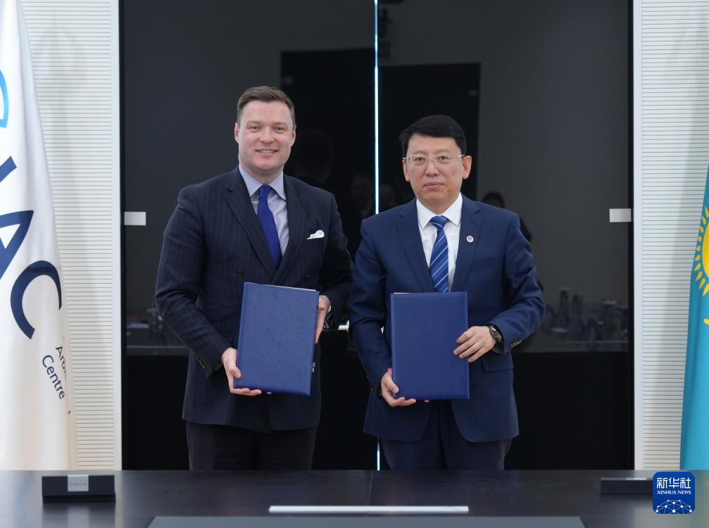 5月26日,在哈萨克斯坦首都阿斯塔纳,中国政法大学党委书记姜泽廷(右)和阿斯塔纳国际金融中心法院和国际仲裁中心首席执行官克里斯托弗·坎贝尔-霍尔特签署合作备忘录后合影。新华社发(奥斯帕诺夫摄)