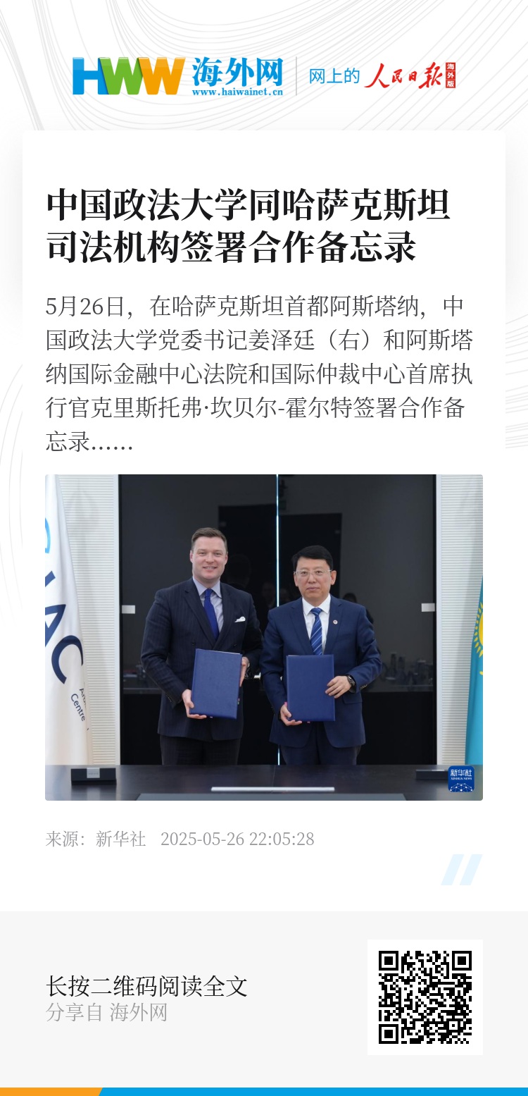 新华社阿斯塔纳5月26日电(记者张继业)中国政法大学和阿斯塔纳国际金融中心法院及国际仲裁中心26日在哈萨克斯坦首都阿斯塔纳签署合作备忘录,计划共同开展国际仲裁实务合作和高层次涉外法治人才培养等。
