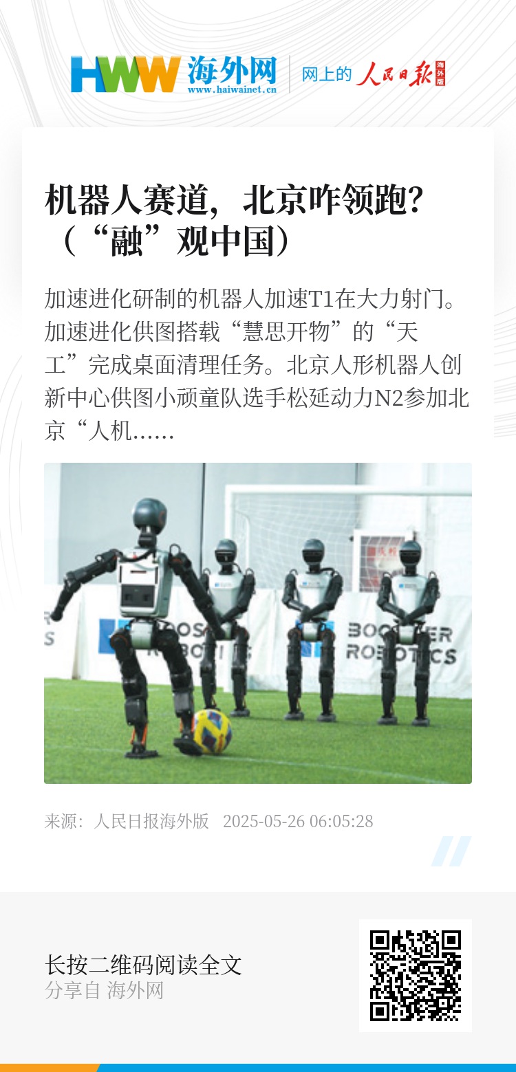 今年8月,首届世界人形机器人运动会即将在北京举办,机器人足球赛是主体赛事之一。加速进化与组委会合作,为参赛队伍提供技术培训和支持。“为了让参赛队伍提升技战术水平,我们正在举办正式比赛前的能力测试赛,给队伍们提供机器人本体和训练环境,以赛代练。”加速进化市场负责人徐磊告诉记者。这家年轻的公司成立于2023年,位于北京海淀。