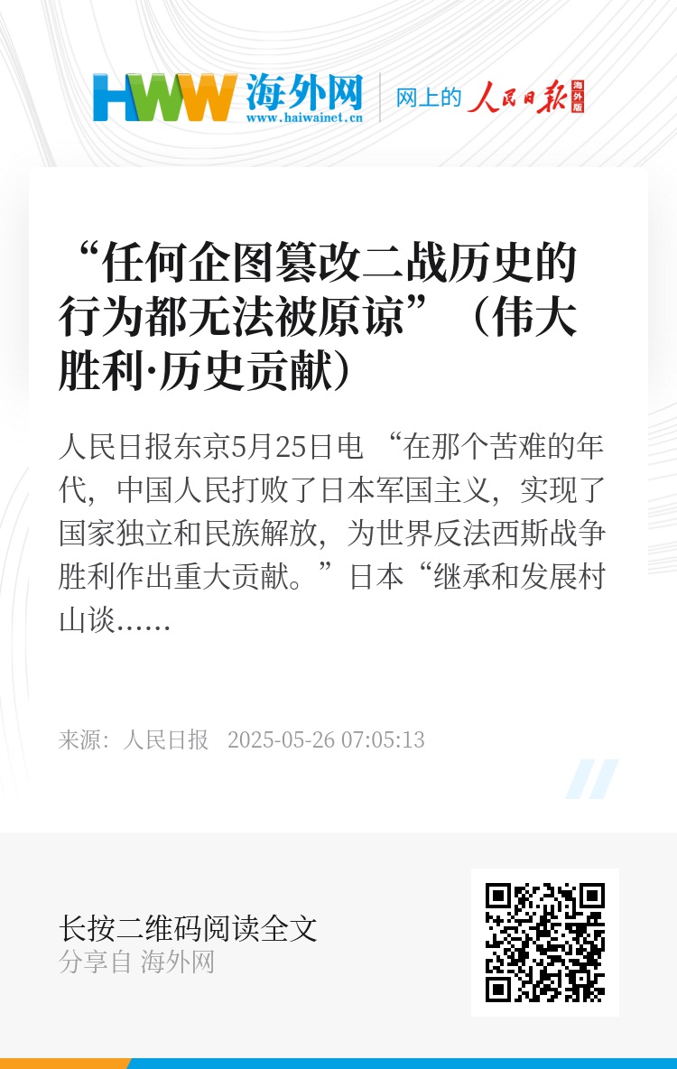 藤田高景表示,“继承和发展村山谈话会”一直主张并呼吁“以史为鉴才能面向未来”,日本应该真诚地为发动侵略战争的罪行忏悔,信守“誓不再战”的诺言,只有这样才能与邻国长久和平相处。“侵华日军对中国进行了大规模侵略,杀害了大量中国军民。日本发动侵略战争的历史铁证如山,日本必须正视历史、反省罪行。”藤田高景说,“任何企图篡改二战历史的行为都无法被原谅。”