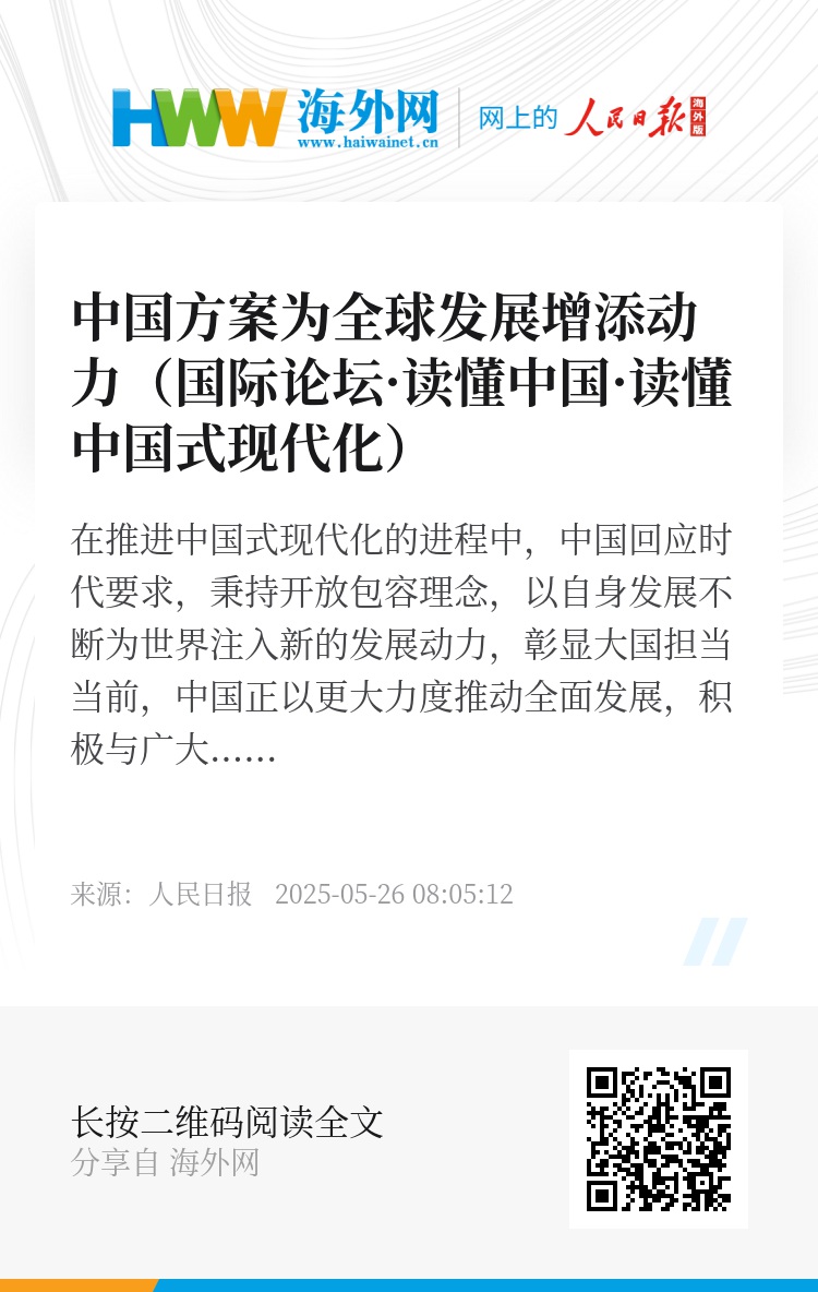 当前,中国正以更大力度推动全面发展,积极与广大发展中国家分享现代化经验,为人类共同发展注入更多动力。在推进中国式现代化的进程中,中国回应时代要求,秉持开放包容理念,以自身发展不断为世界注入新的发展动力,彰显大国担当。