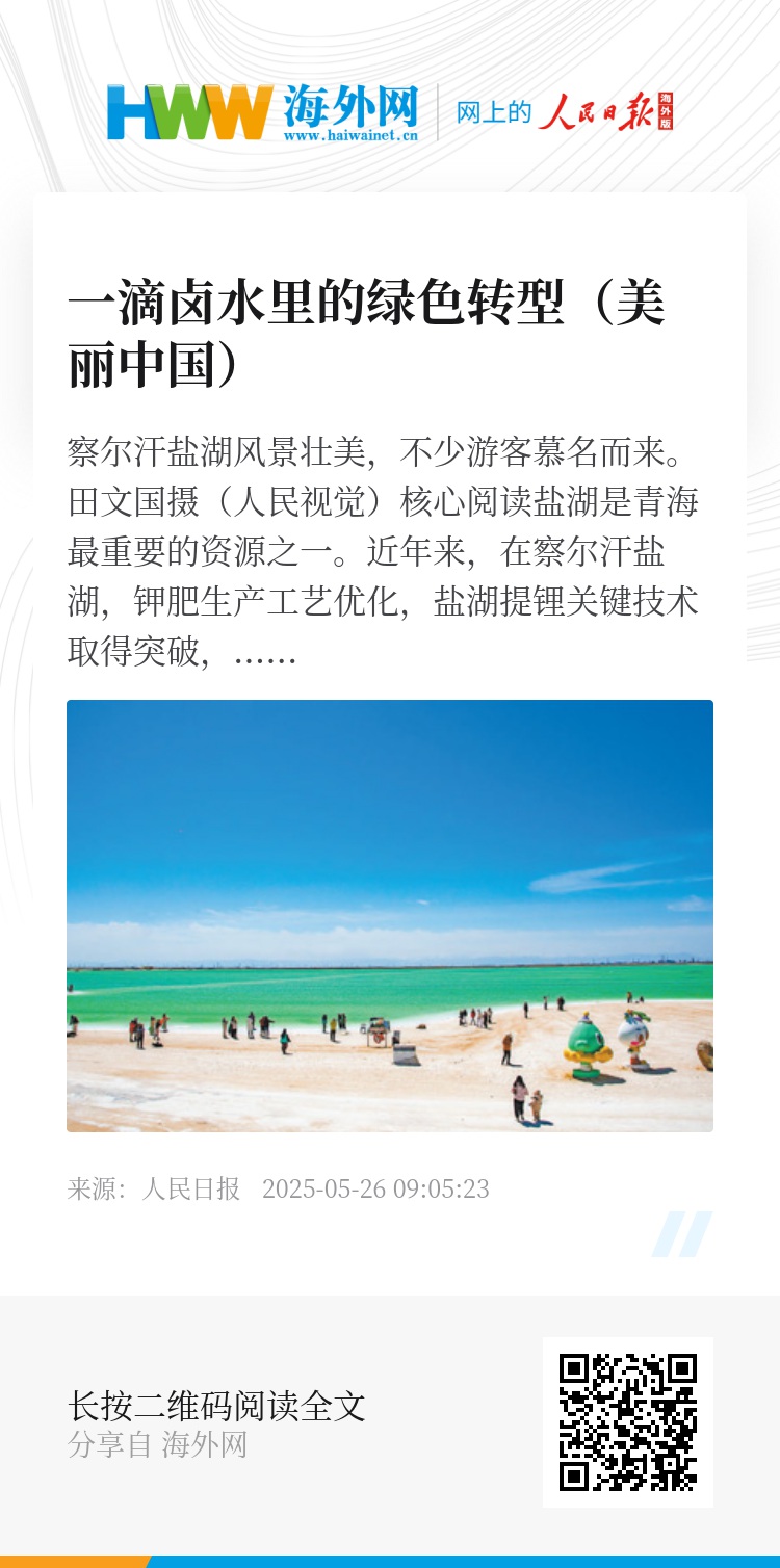 盐湖是青海最重要的资源之一。近年来,在察尔汗盐湖,钾肥生产工艺优化,盐湖提锂关键技术取得突破,绿色、高效开采水平不断提升,节能降碳、绿色发展理念深入人心。