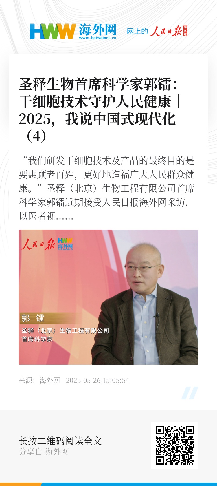 “我们研发干细胞技术及产品的最终目的是要惠顾老百姓,更好地造福广大人民群众健康。”圣释(北京)生物工程有限公司首席科学家郭镭近期接受人民日报海外网采访,以医者视角阐释干细胞技术的民生价值。作为人脐带间充质基质细胞保藏国际标准主导制定者,圣释生物正通过技术创新与标准化制备,为人民健康提供新的解决方案。
