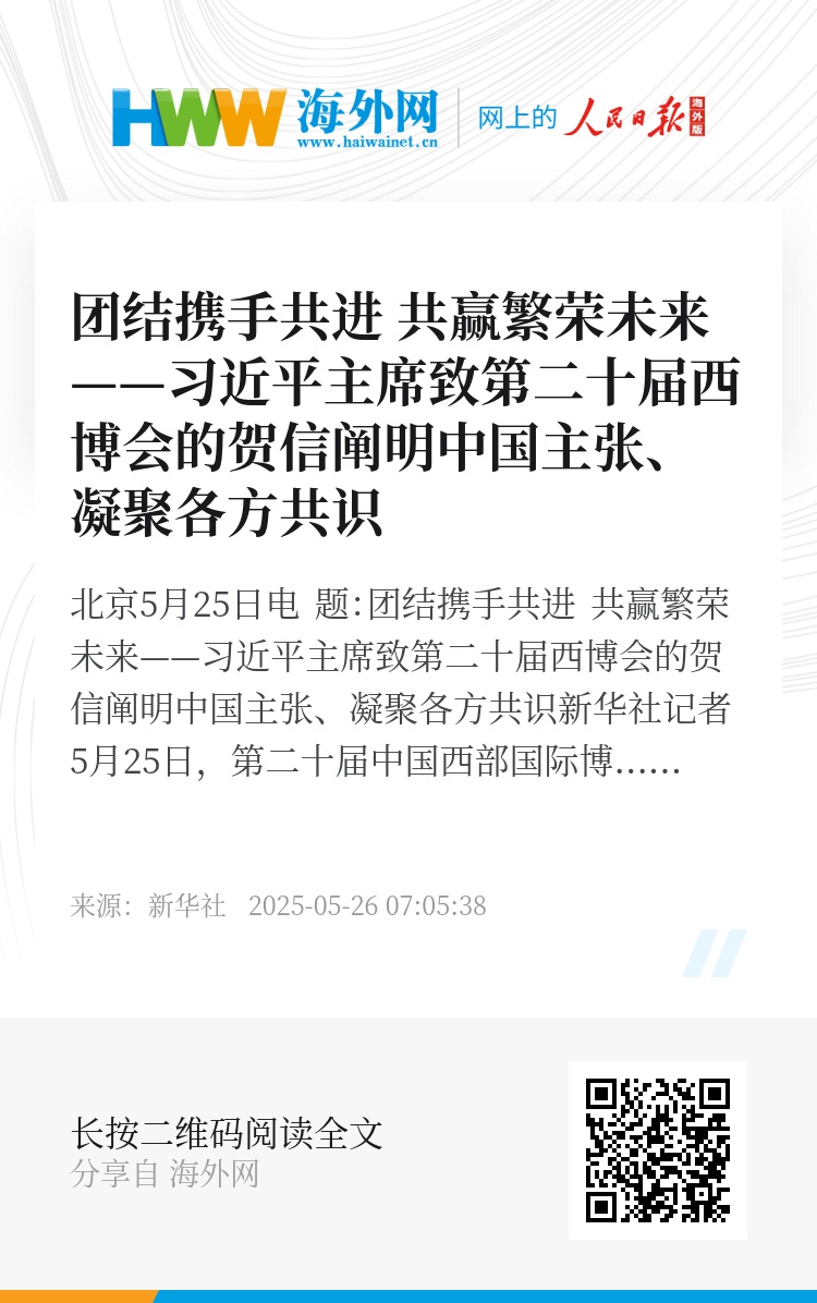 新华社北京5月25日电 题:团结携手共进 共赢繁荣未来——习近平主席致第二十届西博会的贺信阐明中国主张、凝聚各方共识